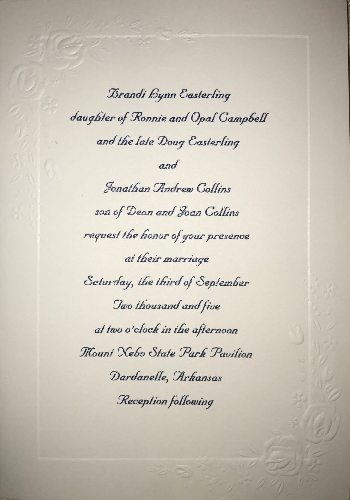 There are some times more than others when I miss my dad, like when I got married. It’s not conventional, but I included my father’s name on my wedding invitations. Jonathan and I were hosting the wedding ourselves, so the invitation had a listing of our names and our parents, so adding “the late Doug Easterling” to the invitation seemed fitting. I don’t really care what rules of etiquette that violated. It was important to me. Also, in the picture collage we displayed at the ceremony, were pictures of my dad along with my stepfather and the rest of my immediate family. He’s always been part of my life as much as the Easterling name is ingrained into my soul.